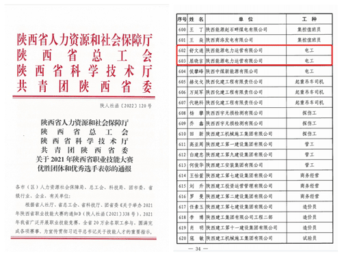 本次榮獲“陜西省技術(shù)能手”的舒文通、屈曉言就是在公司職工技能大賽中涌現(xiàn)出的優(yōu)秀青年技能人才。他們?cè)诩瘓F(tuán)2021年職工職業(yè)技能大賽中,榮獲電工技能競(jìng)賽冠、亞軍。