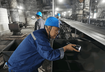 從#1、#2、#3、#4皮帶,一路巡檢到65米高的#5皮帶。黑暗的空間里,張炳立一路不語,不時(shí)用手電筒在皮帶上照照,聽音棒在軸承座聽聽,測溫儀在電機(jī)上量量,時(shí)而又掏出筆記本在上面記記。