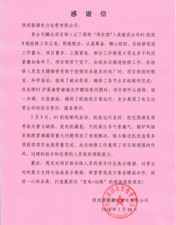 近日,公司收到來自麟北發(fā)電公司的感謝信,對麟北項(xiàng)目部在麟北發(fā)電公司#1機(jī)組B級檢修工作中展現(xiàn)出的頑強(qiáng)作風(fēng),過硬技術(shù)和組織調(diào)配能力表示感謝。