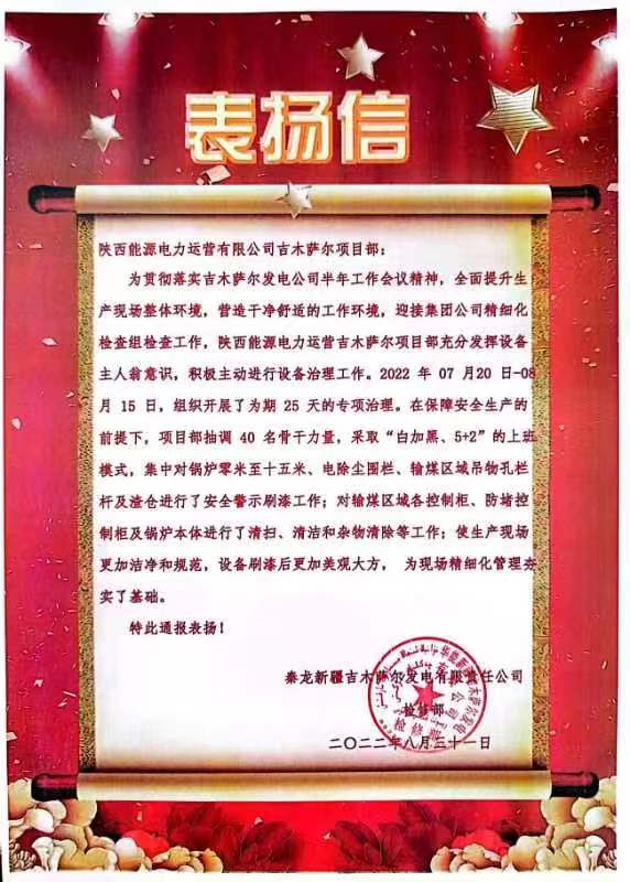 9月1日,公司相繼收到吉木薩爾發(fā)電檢修部、商洛發(fā)電設(shè)備部發(fā)來的表揚(yáng)信,對吉木薩爾項目部高效優(yōu)質(zhì)完成為期25天的設(shè)備專項治理和商洛項目部鍋爐班加班加點(diǎn)完成搶修表示感謝。