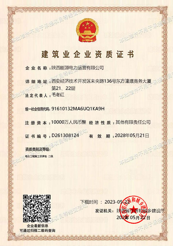 5月22日,經(jīng)陜西省住房和城鄉(xiāng)建設廳審批,公司順利取得電力工程施工總承包二級資質(zhì),為承攬單機容量20萬千瓦以下發(fā)電工程、220千伏以下送電線路和相同電壓等級的變電站工程的施工業(yè)務贏得“入場券”,對公司“一體兩翼雙平臺”發(fā)展戰(zhàn)略布局具有重要意義。