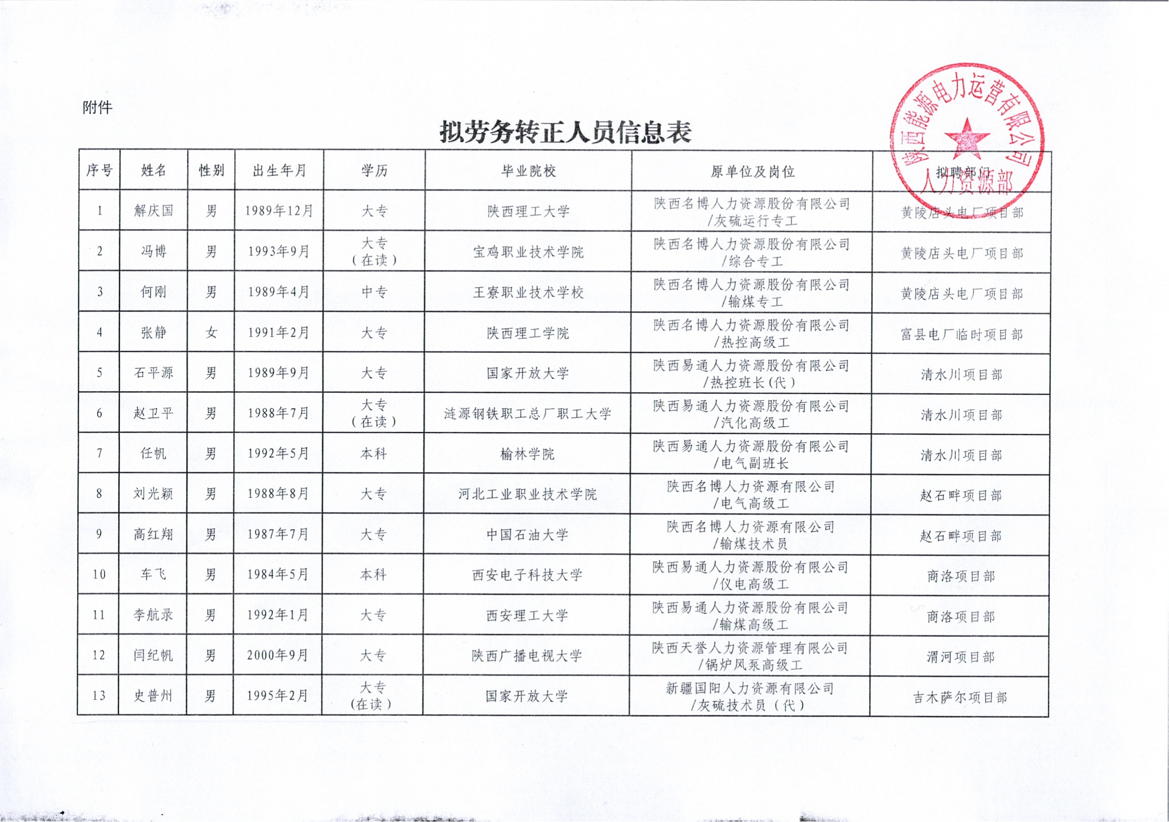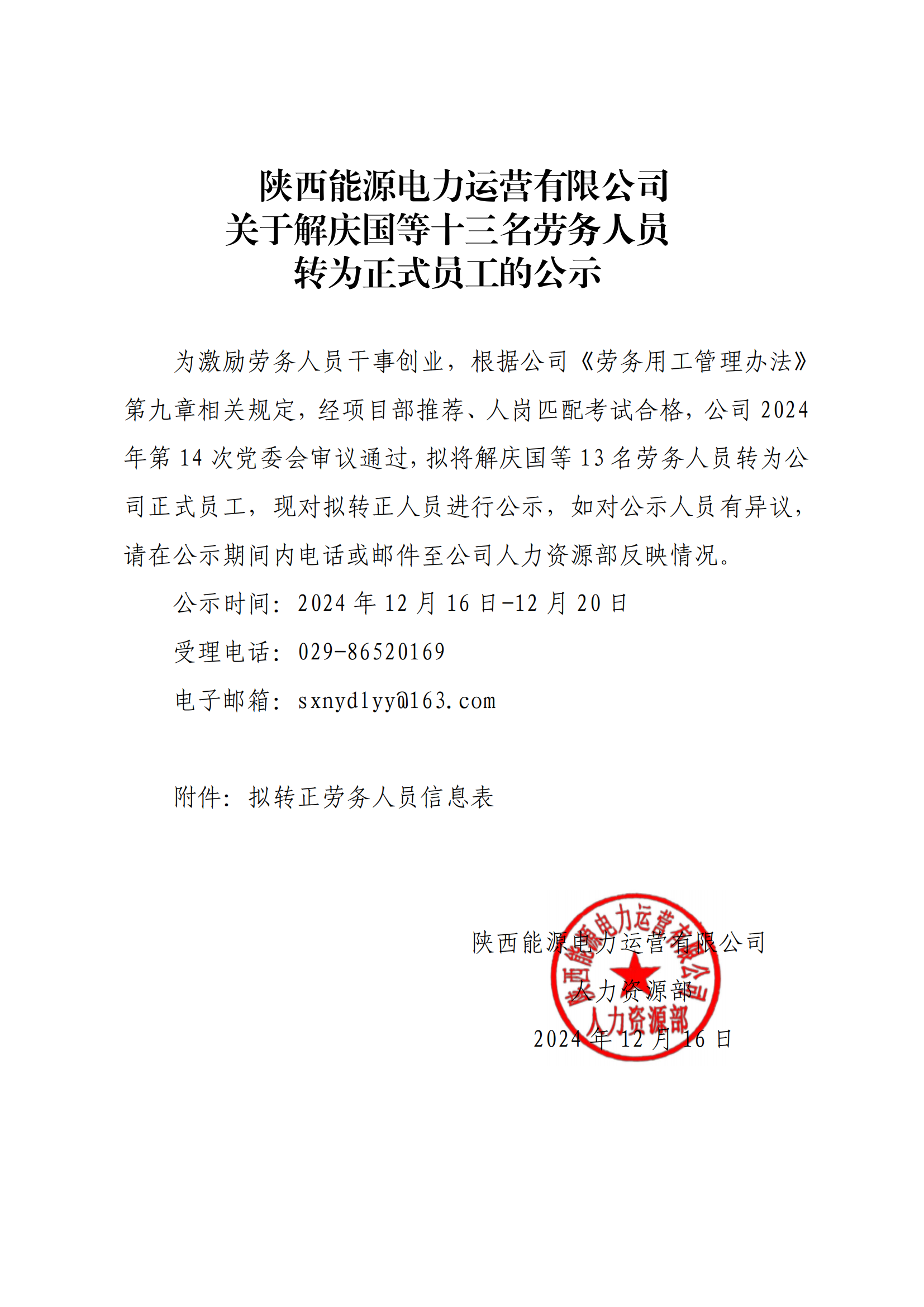 關(guān)于解慶國等十三名勞務(wù)人員轉(zhuǎn)為正式員工的公示