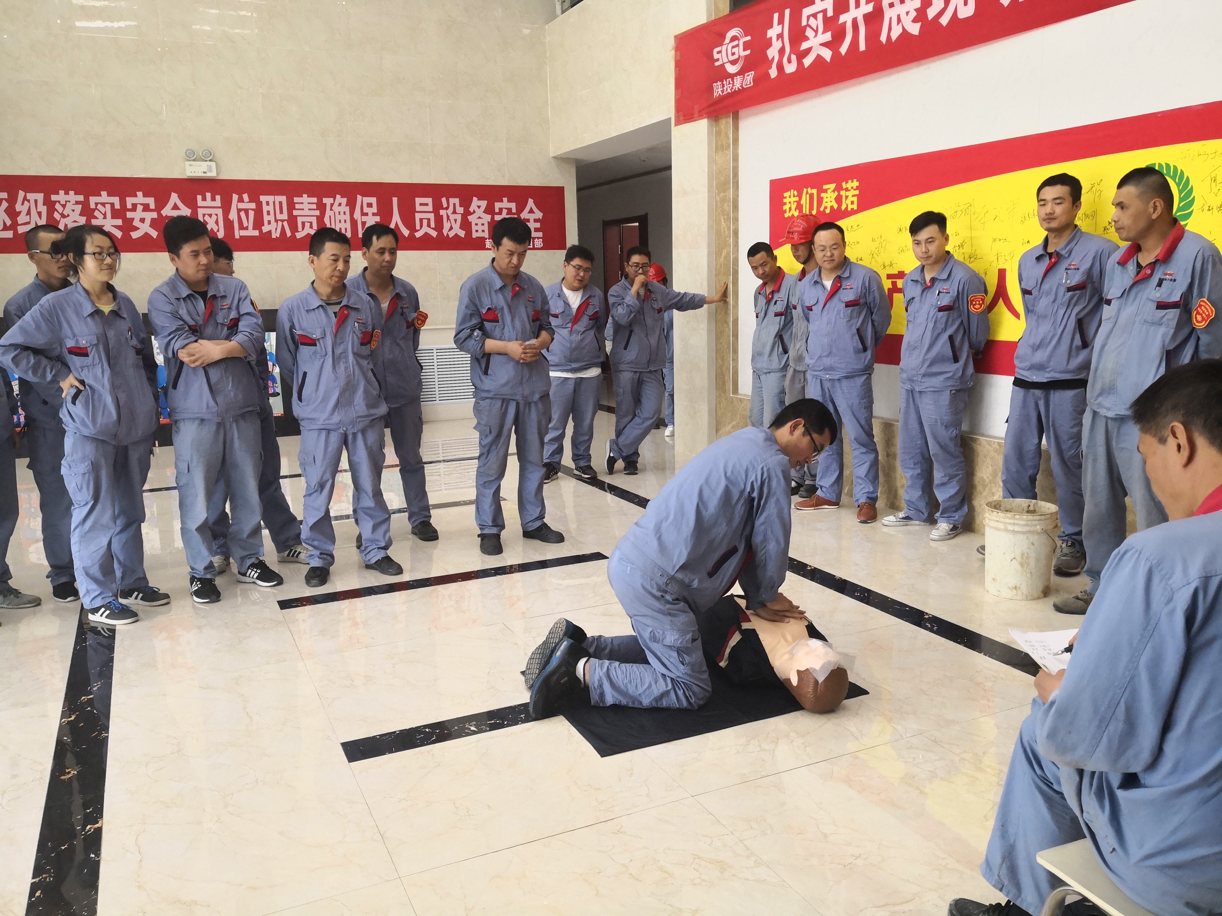 6月2日,進行胸外按壓和人工呼吸方法培訓;3日,項目部應急組織骨干成員,進行電梯緊急救援實地培訓;5日,張貼懸掛自制的宣傳橫幅和展板,通過形象有趣的圖文,宣傳安全知識。