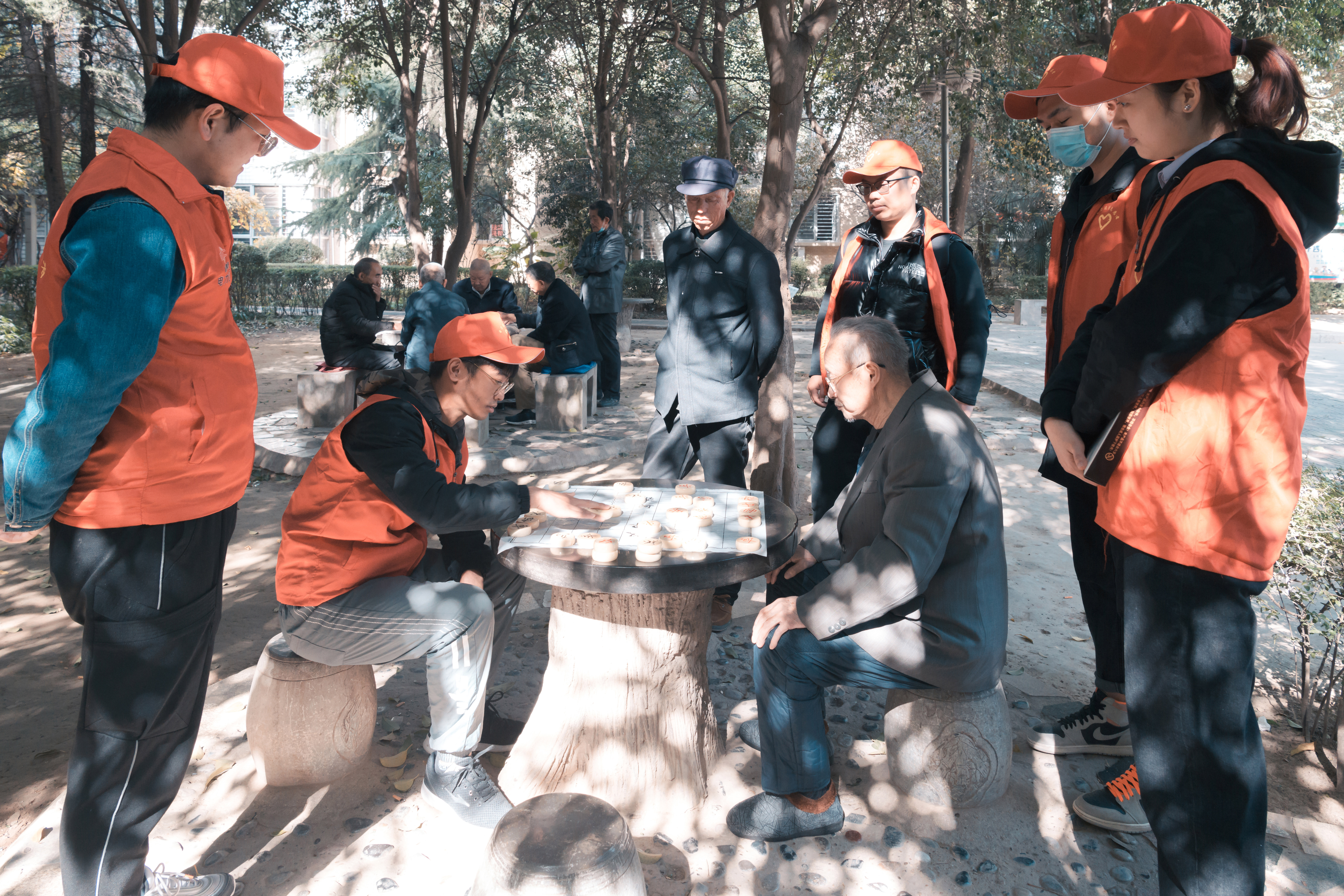 午飯過后,志愿者們帶著老人們來到了社區(qū)的中心廣場(chǎng)。他們有的陪老人散步、閑話家常;有的陪老人擺開棋陣、對(duì)陣博弈;有的捶肩搓手、噓寒問暖;有的大秀才藝,給老人們解悶……志愿者的到來令老人們心情愉悅,他們也紛紛敞開心扉,分享起歡樂的往事,歡聲笑語不時(shí)回蕩在在冬日的暖陽(yáng)下。